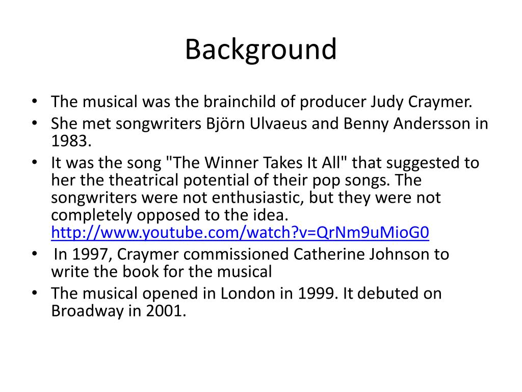 Background • The musical was the brainchild of producer Judy Craymer. • She met songwriters Björn Ulvaeus and Benny Andersson in 1983. • It was the song "The Winner Takes It All" that suggested to her the theatrical potential of their pop songs. The songwriters were not enthusiastic, but they were not completely opposed to the idea. http://www.youtube.com/watch?v=QrNm9uMioG0 • In 1997, Craymer commissioned Catherine Johnson to write the book for the musical • The musical opened in London in 1999. It debuted on Broadway in 2001.