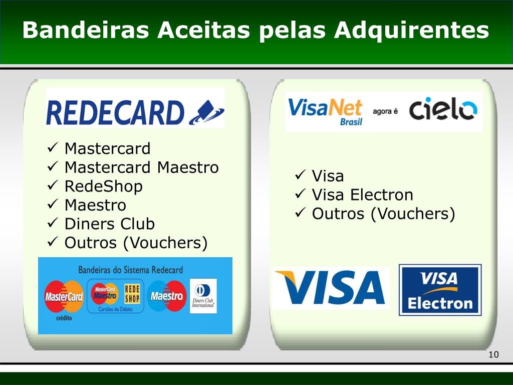 Mastercard • Mastercard Maestro • RedeShop • Maestro • Diners Club • Outros (Vouchers) • Visa • Visa Electron • Outros (Vouchers) Bandeiras Aceitas pelas Adquirentes