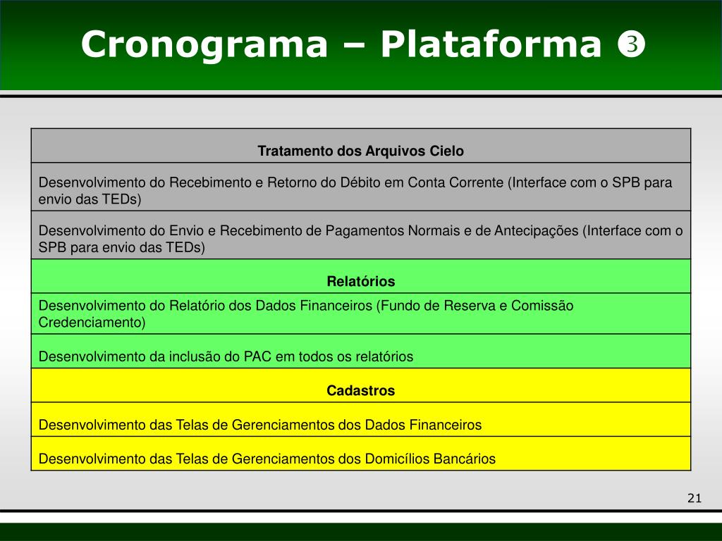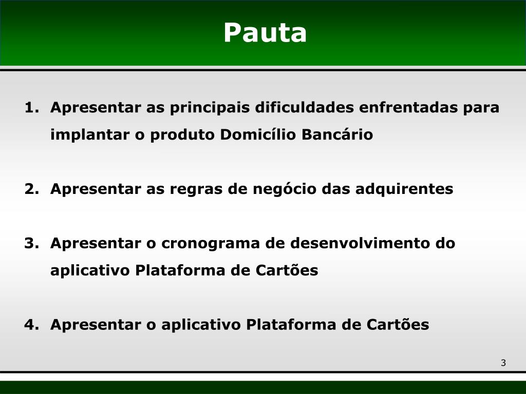 Pauta Apresentar as principais dificuldades enfrentadas para implantar o produto Domicílio Bancário Apresentar as regras de negócio das adquirentes Apresentar o cronograma de desenvolvimento do aplicativo Plataforma de Cartões Apresentar o aplicativo Plataforma de Cartões