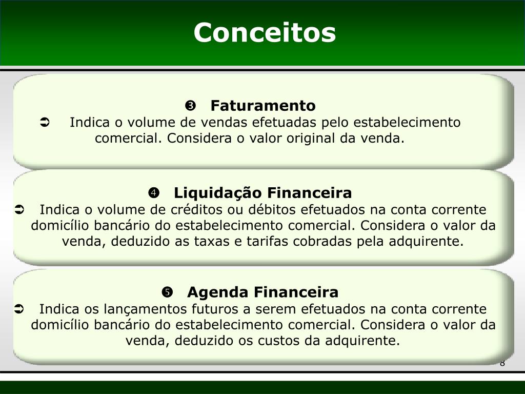 Faturamento • Indica o volume de vendas efetuadas pelo estabelecimento comercial. Considera o valor original da venda. Liquidação Financeira • Indica o volume de créditos ou débitos efetuados na conta corrente domicílio bancário do estabelecimento comercial. Considera o valor da venda, deduzido as taxas e tarifas cobradas pela adquirente. Agenda Financeira • Indica os lançamentos futuros a serem efetuados na conta corrente domicílio bancário do estabelecimento comercial. Considera o valor da venda, deduzido os custos da adquirente. Conceitos