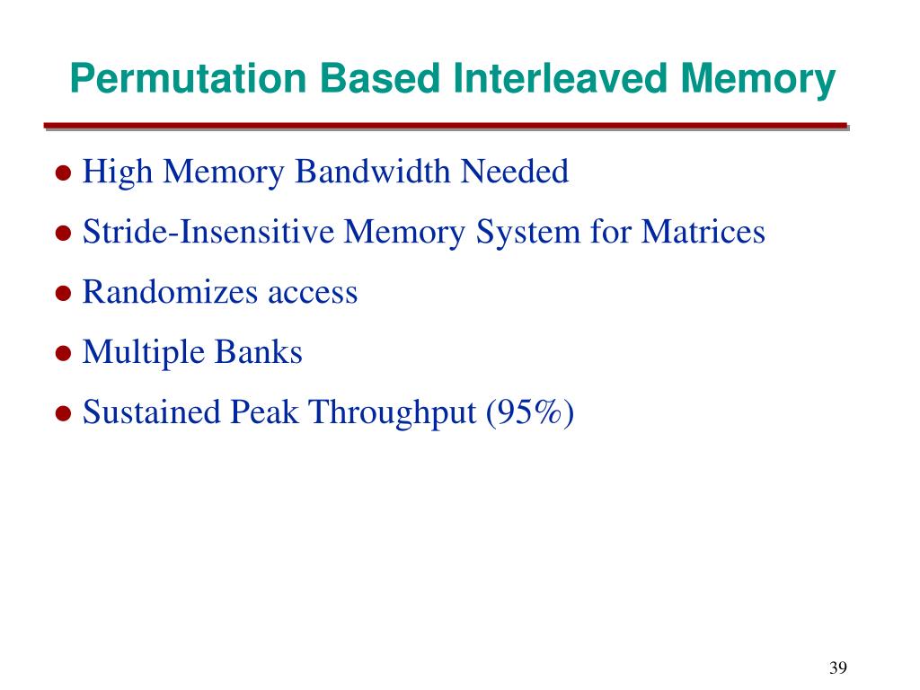 Permutation Based Interleaved Memory • High Memory Bandwidth Needed • Stride-Insensitive Memory System for Matrices • Randomizes access • Multiple Banks • Sustained Peak Throughput (95%)