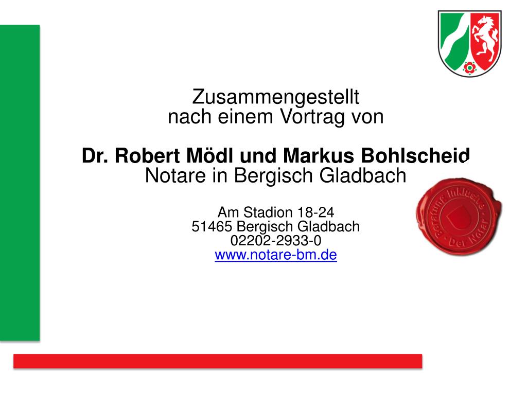 Zusammengestellt nach einem Vortrag von Dr. Robert Mödl und Markus Bohlscheid Notare in Bergisch Gladbach Am Stadion 18-24 51465 Bergisch Gladbach 02202-2933-0 www.notare-bm.de