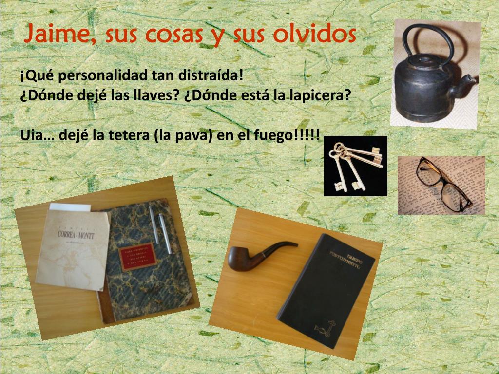 Jaime, sus cosas y sus olvidos ¡Qué personalidad tan distraída! ¿Dónde dejé las llaves? ¿Dónde está la lapicera? Uia… dejé la tetera (la pava) en el fuego!!!!!