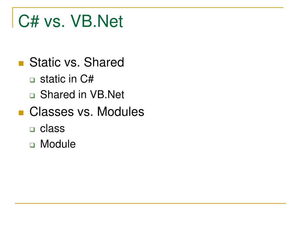 C# vs. VB.Net • Static vs. Shared • static in C# • Shared in VB.Net • Classes vs. Modules • class • Module