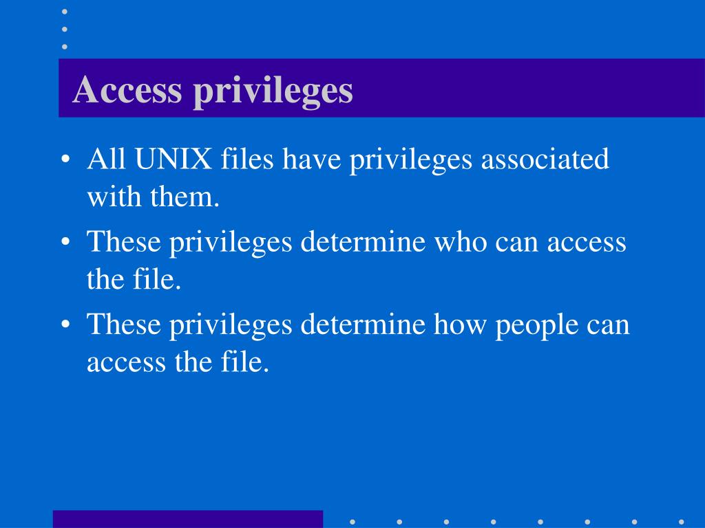Access privileges • All UNIX files have privileges associated with them. • These privileges determine who can access the file. • These privileges determine how people can access the file.
