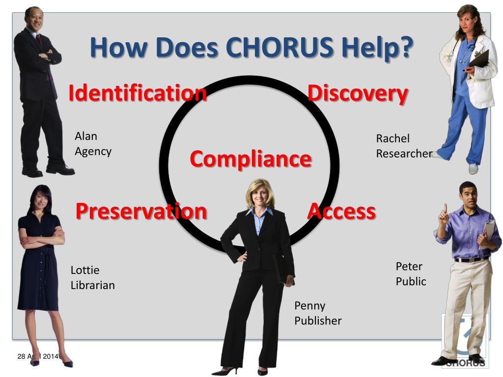 How Does CHORUS Help? Identification Discovery Alan Agency Rachel Researcher Compliance Preservation Access Peter Public Lottie Librarian Penny Publisher