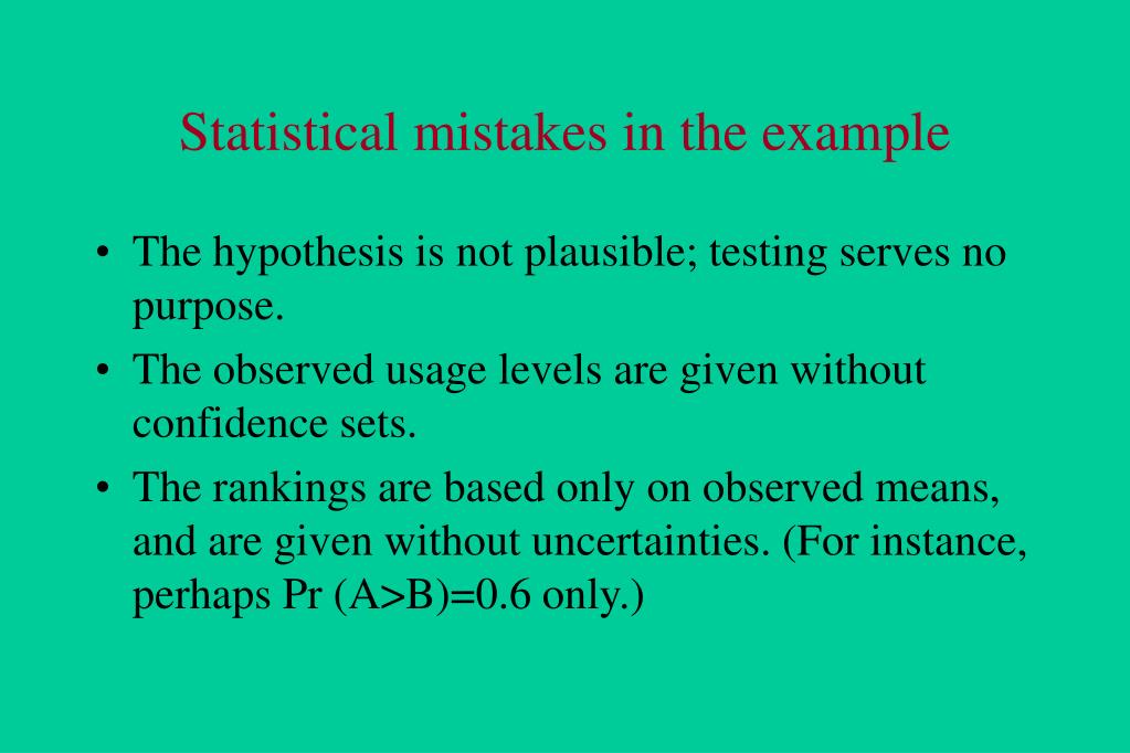 Statistical mistakes in the example • The hypothesis is not plausible; testing serves no purpose. • The observed usage levels are given without confidence sets. • The rankings are based only on observed means, and are given without uncertainties. (For instance, perhaps Pr (A>B)=0.6 only.)