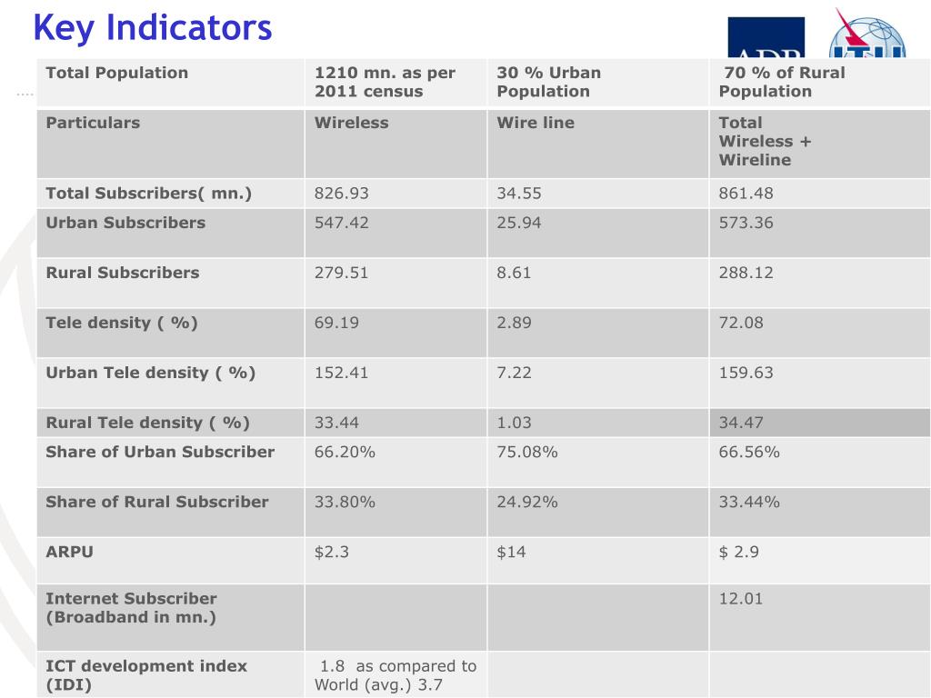 Country Presentation India. Rural ICT Policy Advocacy, Knowledge Sharing and Capacity Building Regional Project. Regional Multi-stakeholder Discussion Forum on Rural ICT Development Bangkok, Thailand, 4 July 2011. Key Indicators. Status .