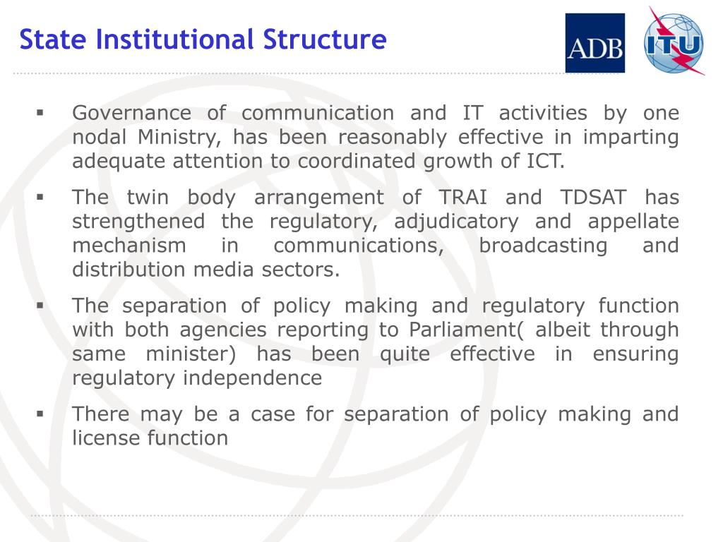 State Institutional Structure • Governance of communication and IT activities by one nodal Ministry, has been reasonably effective in imparting adequate attention to coordinated growth of ICT. • The twin body arrangement of TRAI and TDSAT has strengthened the regulatory, adjudicatory and appellate mechanism in communications, broadcasting and distribution media sectors. • The separation of policy making and regulatory function with both agencies reporting to Parliament( albeit through same minister) has been quite effective in ensuring regulatory independence • There may be a case for separation of policy making and license function
