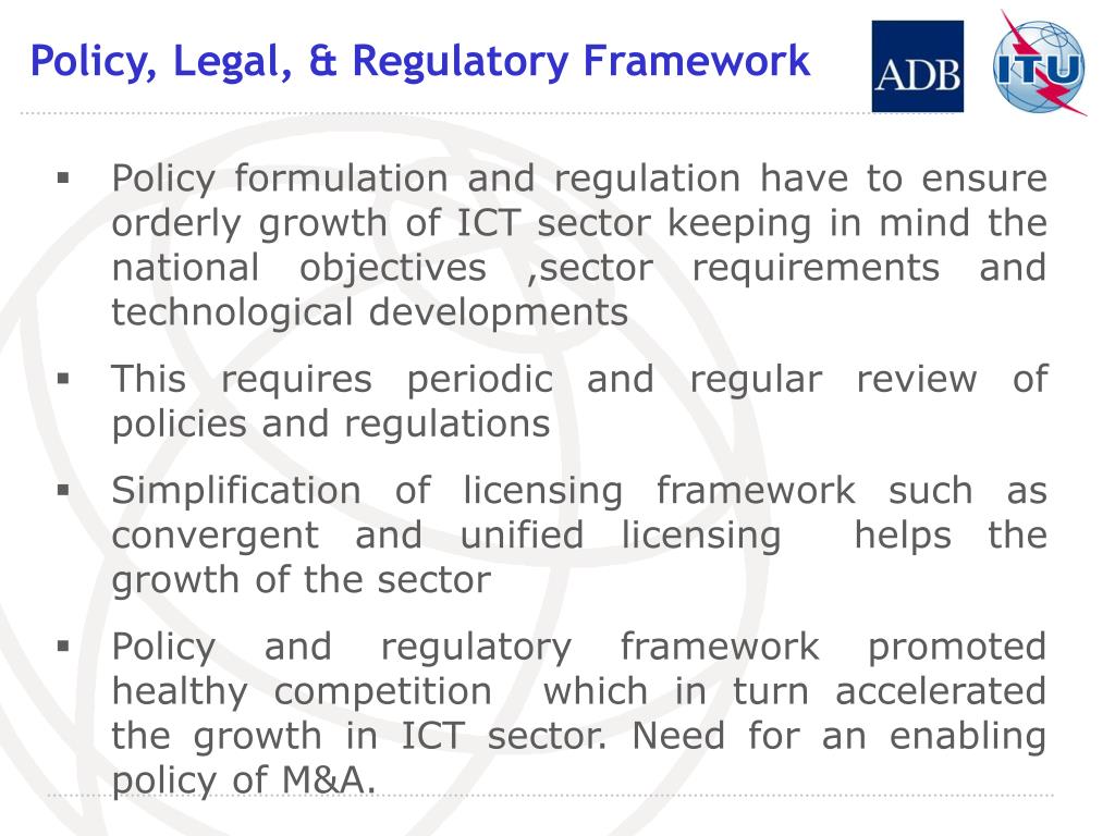 Policy, Legal, & Regulatory Framework • Policy formulation and regulation have to ensure orderly growth of ICT sector keeping in mind the national objectives ,sector requirements and technological developments • This requires periodic and regular review of policies and regulations • Simplification of licensing framework such as convergent and unified licensing helps the growth of the sector • Policy and regulatory framework promoted healthy competition which in turn accelerated the growth in ICT sector. Need for an enabling policy of M&A.
