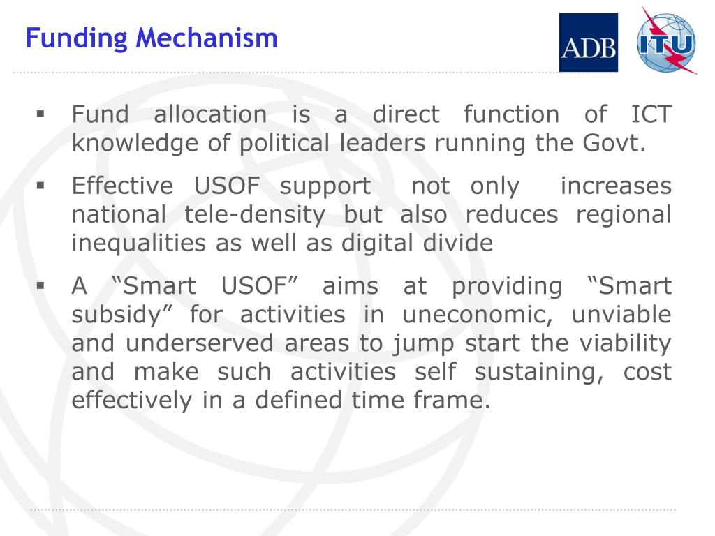 Funding Mechanism • Fund allocation is a direct function of ICT knowledge of political leaders running the Govt. • Effective USOF support not only increases national tele-density but also reduces regional inequalities as well as digital divide • A “Smart USOF” aims at providing “Smart subsidy” for activities in uneconomic, unviable and underserved areas to jump start the viability and make such activities self sustaining, cost effectively in a defined time frame.