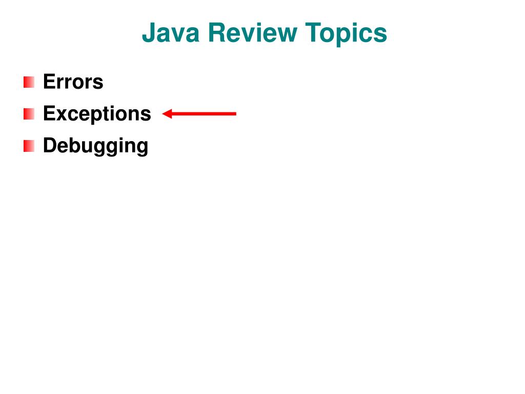 Java Review 2 – Errors, Exceptions, Debugging. Nelson Padua-Perez Chau-Wen Tseng Department of Computer Science University of Maryland, College Park. Java Review Topics. Errors Exceptions Debugging. Program Errors. Types of errors Compile-time (syntax) errors Run-time errors