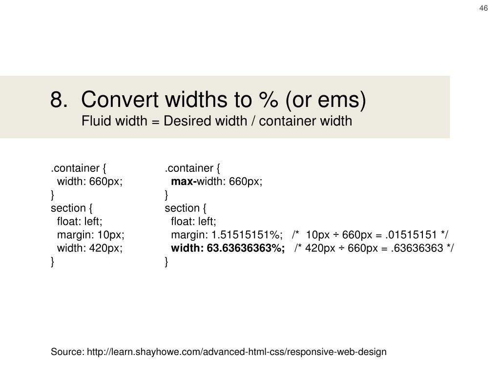 8. Convert widths to % (or ems)Fluid width = Desired width / container width .container { width: 660px; } section { float: left; margin: 10px; width: 420px; } .container { max-width: 660px; } section { float: left; margin: 1.51515151%; /* 10px ÷ 660px = .01515151 */ width: 63.63636363%; /* 420px ÷ 660px = .63636363 */ } Source: http://learn.shayhowe.com/advanced-html-css/responsive-web-design