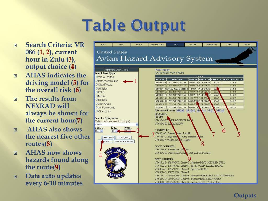 Table OutputRisk determination • The AHAS risk is determined based on the highest risk between the soaring model and the NEXRAD risk • If both the NEXRAD risk and the soaring data are not available, the AHAS risk will be based on the BAM • If the NEXAD risk is missing and the soaring model is LOW, the AHAS risk will be based on the BAM • If the soaring data is missing and the NEXRAD risk is LOW, the AHAS risk will be based on the BAM • Missing NEXRAD data will be indicated on the web page as “NO DATA” in the NEXRAD column • Missing soaring data will be indicated on the web page as “NO DATA” in the Height column Outputs