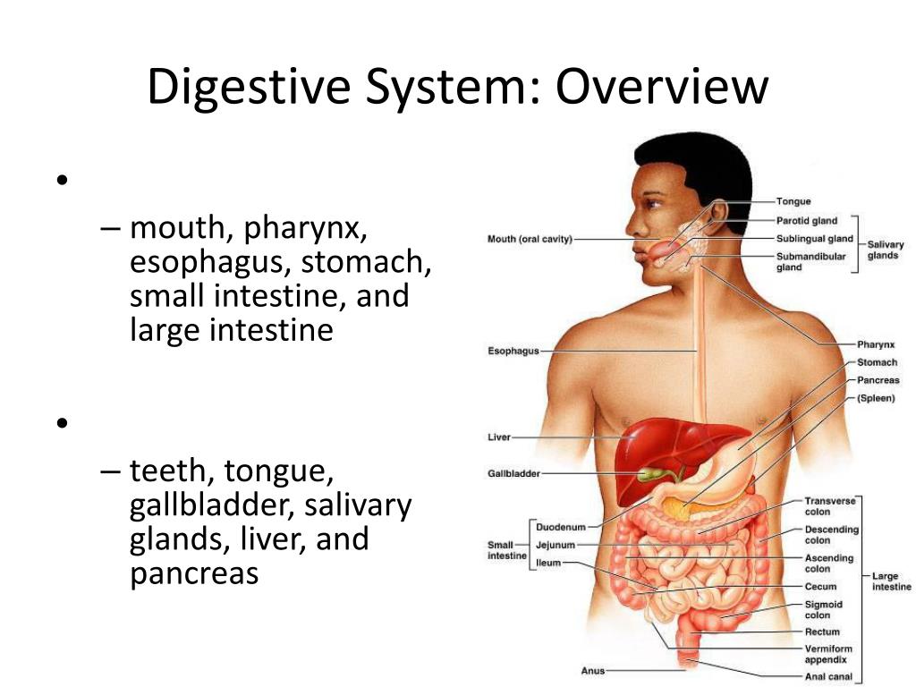 Digestive System: Overview • mouth, pharynx, esophagus, stomach, small intestine, and large intestine • teeth, tongue, gallbladder, salivary glands, liver, and pancreas