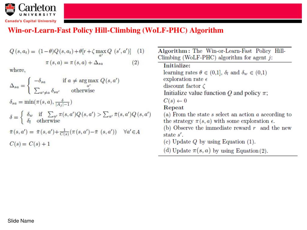 Win-or-Learn Fast Policy Hill Climbing (WoLF-PHC) • This is a gradient learning with a variable learning rate depending on whether the agent is winning or losing. • The Algorithm is: • Where,