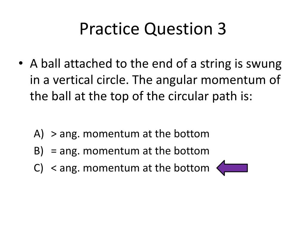 Practice Question 3 • A ball attached to the end of a string is swung in a vertical circle. The angular momentum of the ball at the top of the circular path is: • > ang. momentum at the bottom • = ang. momentum at the bottom • < ang. momentum at the bottom