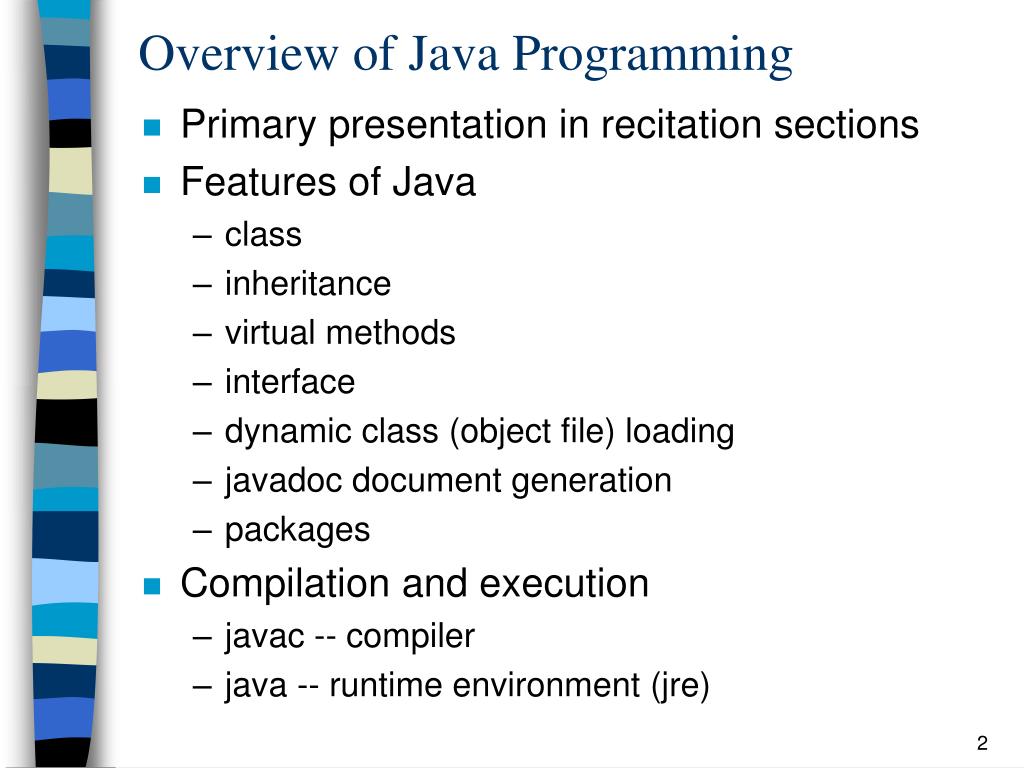 Overview of Java Programming • Primary presentation in recitation sections • Features of Java • class • inheritance • virtual methods • interface • dynamic class (object file) loading • javadoc document generation • packages • Compilation and execution • javac -- compiler • java -- runtime environment (jre)