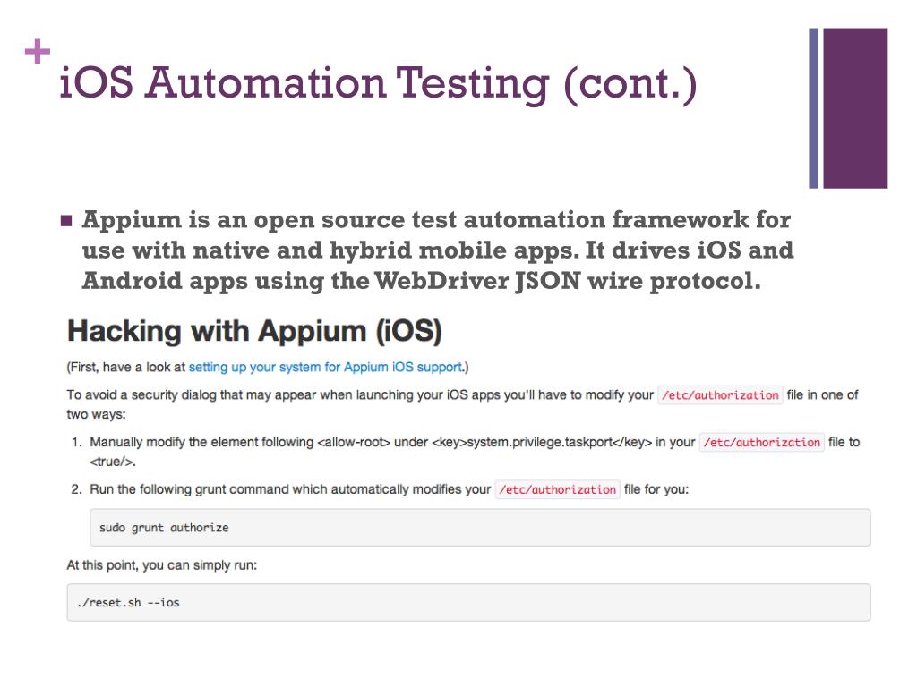 iOS Automation Testing (cont.) • Appiumis an open source test automation framework for use with native and hybrid mobile apps. It drives iOS and Android apps using the WebDriver JSON wire protocol.