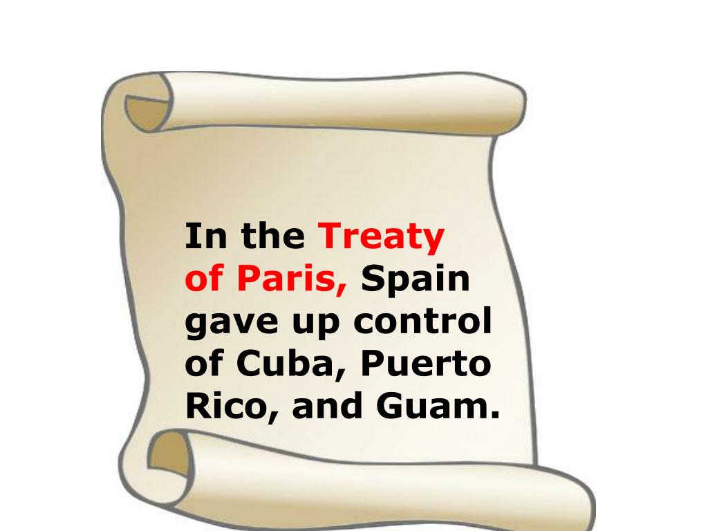 In the Treaty of Paris, Spain gave up control of Cuba, Puerto Rico, and Guam.