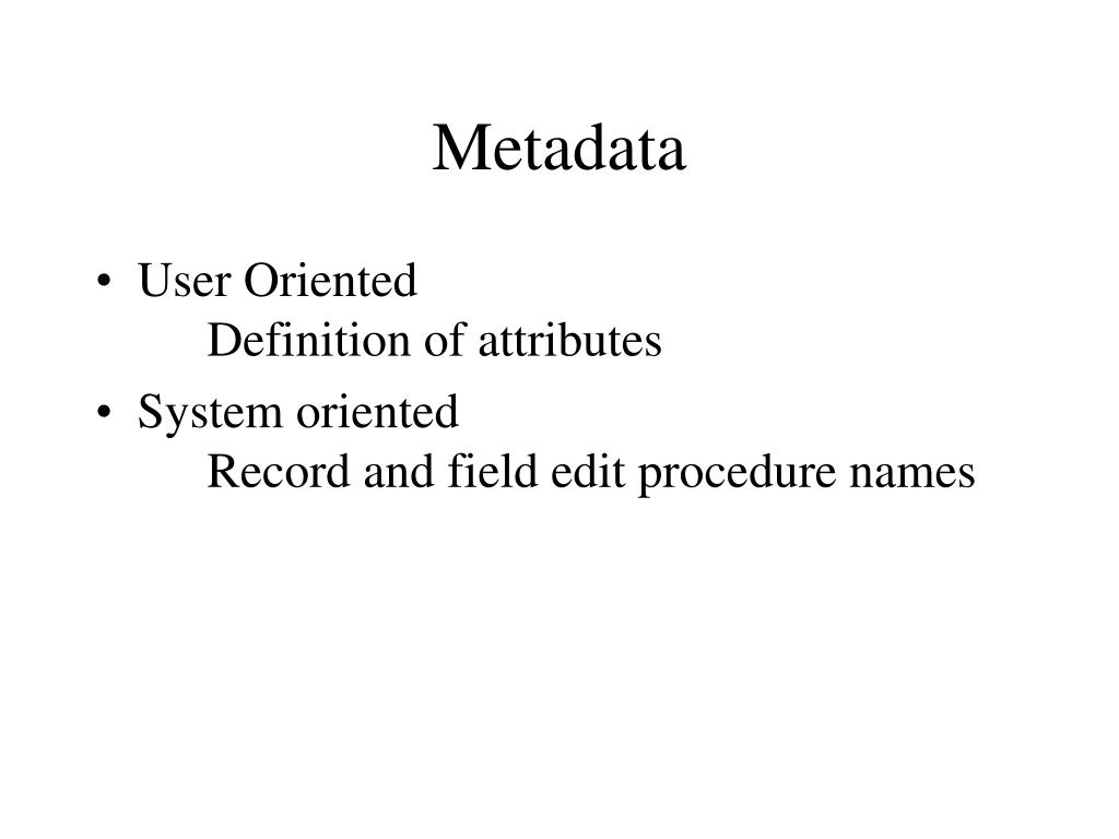 Metadata • User Oriented Definition of attributes • System oriented Record and field edit procedure names