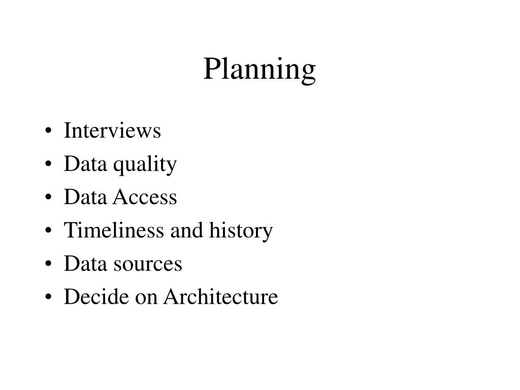 Planning • Interviews • Data quality • Data Access • Timeliness and history • Data sources • Decide on Architecture