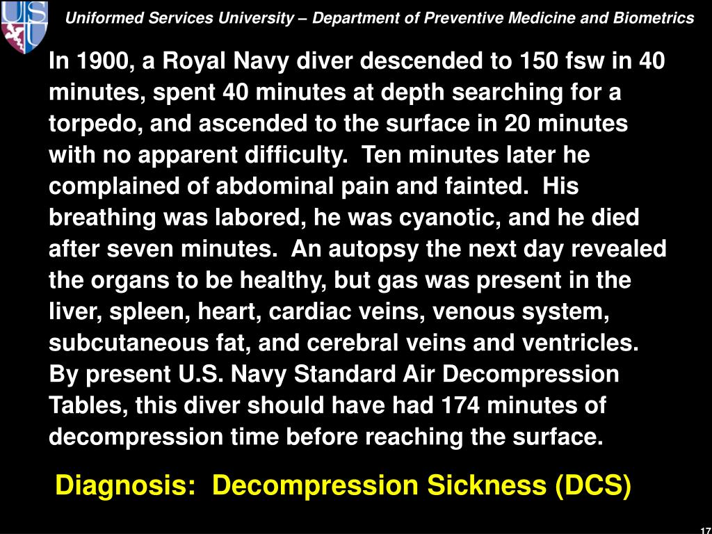 History • DCS recognized in divers and compressed air workers since late 1800s • Prevailing guideline was to ascend slowly • Standards ranged from 1.5 ft/min to 5 ft/min • DCS still occurred but less frequently • Bert*: DCS associated with nitrogen bubbles • Haldane: Shorter/shallower dives associated with less frequent/less severe DCS *Bert P. Barometric pressure. Researches in experimental physiology. Bethesda, MD. Undersea Medical Society, 1878.