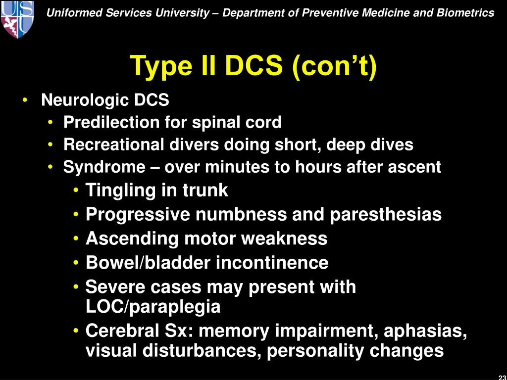 Type II DCS (con’t) • Neurologic DCS • Predilection for spinal cord • Recreational divers doing short, deep dives • Syndrome – over minutes to hours after ascent • Tingling in trunk • Progressive numbness and paresthesias • Ascending motor weakness • Bowel/bladder incontinence • Severe cases may present with LOC/paraplegia • Cerebral Sx: memory impairment, aphasias, visual disturbances, personality changes
