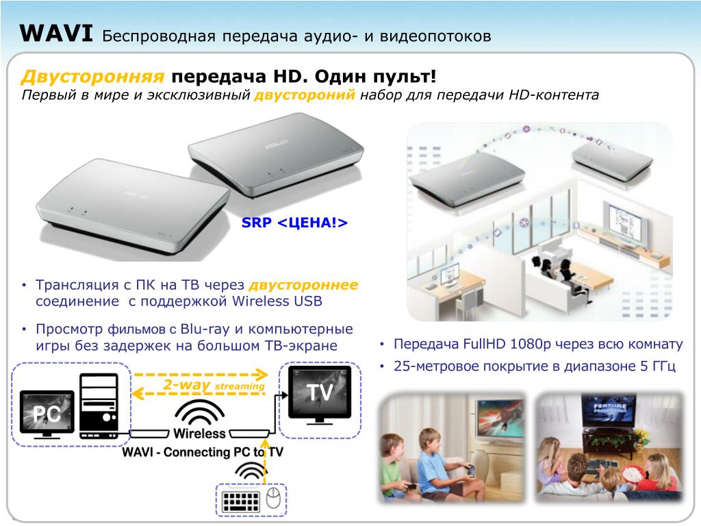 WAVI Беспроводная передача аудио- и видеопотоков Двусторонняяпередача HD. Один пульт!Первый в мире и эксклюзивныйдвусторонийнабор для передачи HD-контента SRP <ЦЕНА!> • Трансляция с ПК на ТВ через двустороннее соединение с поддержкой Wireless USB • Просмотрфильмов с Blu-ray и компьютерные игры без задержекна большом ТВ-экране • Передача FullHD 1080p через всю комнату • 25-метровое покрытие в диапазоне 5 ГГц 2-way streaming