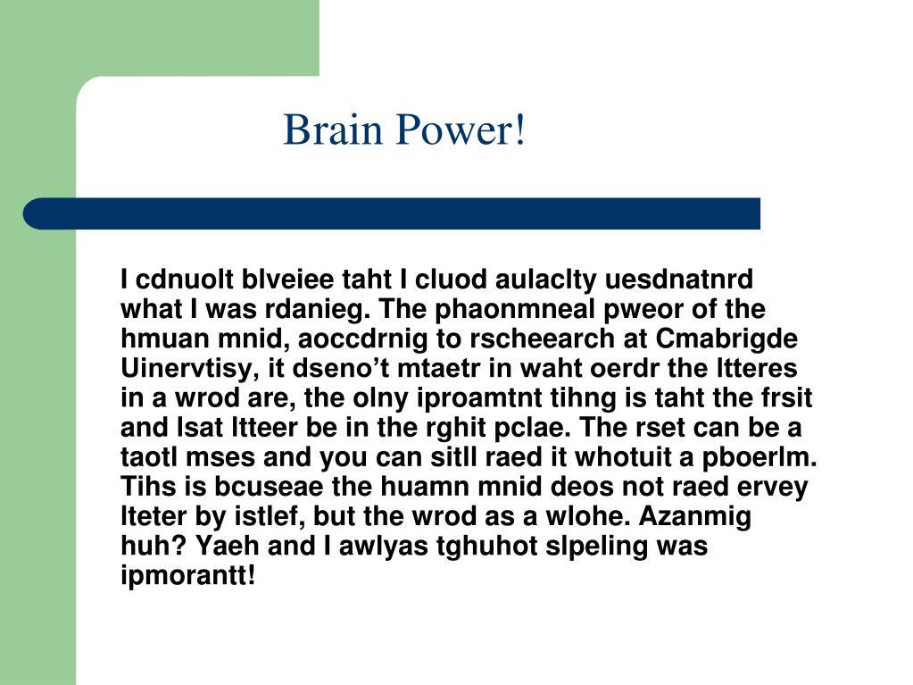 I cdnuolt blveiee taht I cluod aulaclty uesdnatnrd what I was rdanieg. The phaonmneal pweor of the hmuan mnid, aoccdrnig to rscheearch at Cmabrigde Uinervtisy, it dseno’t mtaetr in waht oerdr the ltteres in a wrod are, the olny iproamtnt tihng is taht the frsit and lsat ltteer be in the rghit pclae. The rset can be a taotl mses and you can sitll raed it whotuit a pboerlm. Tihs is bcuseae the huamn mnid deos not raed ervey lteter by istlef, but the wrod as a wlohe. Azanmig huh? Yaeh and I awlyas tghuhot slpeling was ipmorantt! Brain Power!