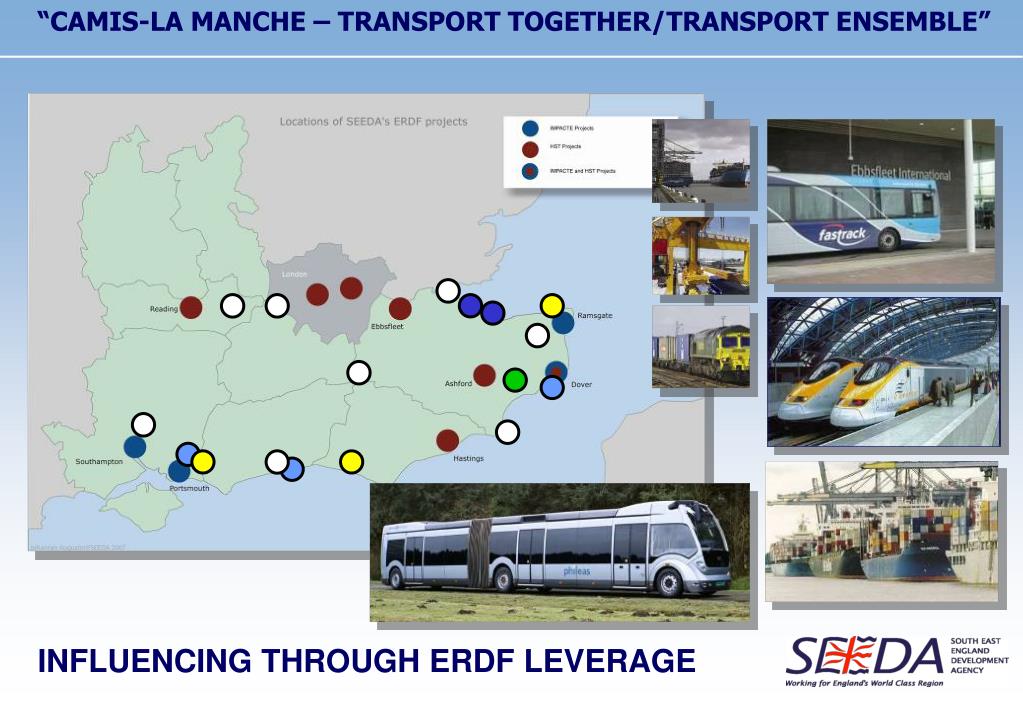 “CAMIS-LA MANCHE – TRANSPORT TOGETHER/TRANSPORT ENSEMBLE” ERDF LEVERAGE into BUSINESS CRITICAL TRANSPORT HST INTEGRATION & CONNECT– INVESTMENT INTO PROVISIONS OF THE PRIMARY NETWORK AND REGIONAL FEEDERING : € 29M / 48% ERDF / 18 PARTNERS (hst4i) and € 20M / 48% ERDF / 12 PARTNERS (hstConnect) IMPACTE – INTERMODAL PORT ACCESS AND COMMODITIES TRANSPORT IN EUROPE € 17M / 30% ERDF / 26 PARTNERS C2C – CONNECT TO COMPETE ( Interreg IVA 2 Seas) PORT ACCESS AND ECONOMIC DEVELOPMENT € 12.6M / 30% ERDF / 8 PARTNERS RoCK – REGIONS OF CONNECTEC KNOWLEDGE (Interreg IVA N.W.E) HST Regional Networks and Transmanche Metro € 12m / 50% ERDF / 15 Partners CAMIS (Interreg IVA Channel) – CHANNEL/ARC MANCHE INTEGRATED STRATEGY (Haute Normandie F) PATCH (Interreg IVA 2 Seas) – PORT MANAGEMENT AND DIVERSIFICATION (Oostende B) INTRADE (Interreg IVB N.W.E) – ICT UTILISATION IN TRANSPORT ( Lille Polytechnic F) Lo-PINOD (Interreg IVB NorthSea) – REGIONAL PORT DEVELOPMENT (SEEDA UK) IKARUS (Interreg IVB NorthSea) – REGIONAL AIRPORTS (SEEDA UK)