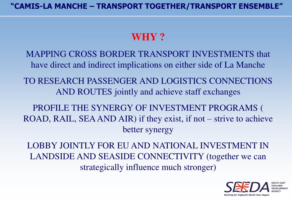 “CAMIS-LA MANCHE – TRANSPORT TOGETHER/TRANSPORT ENSEMBLE” WHY ? MAPPING CROSS BORDER TRANSPORT INVESTMENTS that have direct and indirect implications on either side of La Manche TO RESEARCH PASSENGER AND LOGISTICS CONNECTIONS AND ROUTES jointly and achieve staff exchanges PROFILE THE SYNERGY OF INVESTMENT PROGRAMS ( ROAD, RAIL, SEA AND AIR) if they exist, if not – strive to achieve better synergy LOBBY JOINTLY FOR EU AND NATIONAL INVESTMENT IN LANDSIDE AND SEASIDE CONNECTIVITY (together we can strategically influence much stronger)