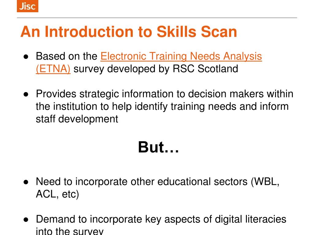 An Introduction to Skills Scan • Based on the Electronic Training Needs Analysis (ETNA) survey developed by RSC Scotland • Provides strategic information to decision makers within the institution to help identify training needs and inform staff development But… • Need to incorporate other educational sectors (WBL, ACL, etc) • Demand to incorporate key aspects of digital literacies into the survey