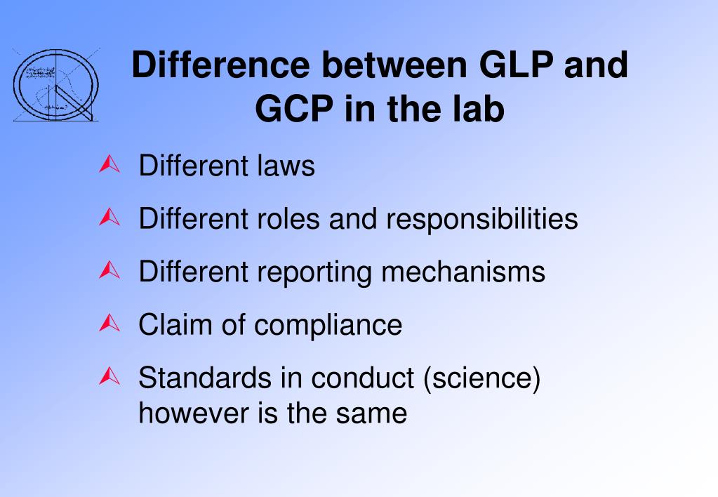 Difference between GLP and GCP in the lab • Different laws • Different roles and responsibilities • Different reporting mechanisms • Claim of compliance • Standards in conduct (science) however is the same