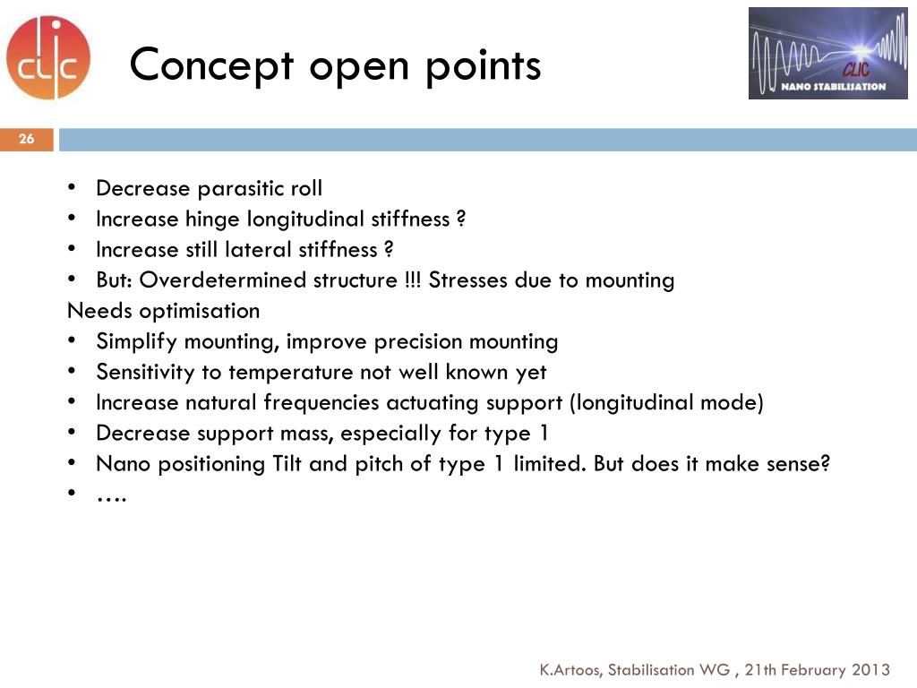 Concept open points • Decrease parasitic roll • Increase hinge longitudinal stiffness ? • Increase still lateral stiffness ? • But: Overdetermined structure !!! Stresses due to mounting • Needs optimisation • Simplify mounting, improve precision mounting • Sensitivity to temperature not well known yet • Increase natural frequencies actuating support (longitudinal mode) • Decrease support mass, especially for type 1 • Nano positioning Tilt and pitch of type 1 limited. But does it make sense? • …. 1&2 K.Artoos, Stabilisation WG , 21th February 2013