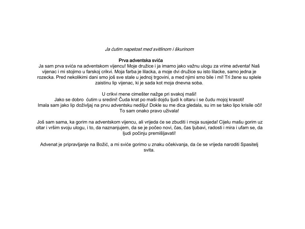 Ja ćutim napetost med svitlinom i škurinom Prva adventska svića Ja sam prva svića na adventskom vijencu! Moje družice i ja imamo jako važnu ulogu za vrime adventa! Naš vijenac i mi stojimo u farskoj crikvi. Moja farba je lilacka, a moje dvi družice su isto lilacke, samo jedna je rozecka. Pred nekolikimi dani smo još sve stale u jednoj trgovini, a med njimi smo bile i mi! Tri žene su splele zaistinu lip vijenac, ki je sada kot moja dnevna soba. U crikvi mene cimešter nažge pri svakoj maši! Jako se dobro ćutim u sredini! Čuda krat po maši dojdu ljudi k oltaru i se čudu mojoj krasoti! Imala sam jako lip doživljaj na prvu adventsku nedilju! Dokle su me dica gledala, su im se tako lipo krisile oči! To sam onako pravo uživala! Još sam sama, ka gorim na adventskom vijencu, ali vrijeda će se zbuditi i moja susjeda! Cijelu mašu gorim uz oltar i vršim svoju ulogu, i to, da naznanjujem, da se je počeo novi, čas, čas ljubavi, radosti i mira i ufam se, da ljudi počinju premišljavati! Advenat je pripravljanje na Božić, a mi sviće gorimo u znaku očekivanja, da će se vrijeda naroditi Spasitelj svita.