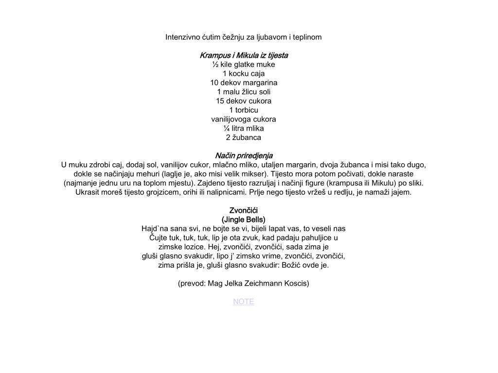 Intenzivno ćutim čežnju za ljubavom i teplinom Krampus i Mikula iz tijesta ½ kile glatke muke 1 kocku caja 10 dekov margarina 1 malu žlicu soli 15 dekov cukora 1 torbicu vanilijovoga cukora ¼ litra mlika 2 žubanca Način priredjenja U muku zdrobi caj, dodaj sol, vanilijov cukor, mlačno mliko, utaljen margarin, dvoja žubanca i misi tako dugo, dokle se načinjaju mehuri (laglje je, ako misi velik mikser). Tijesto mora potom počivati, dokle naraste (najmanje jednu uru na toplom mjestu). Zajdeno tijesto razruljaj i načinji figure (krampusa ili Mikulu) po sliki. Ukrasit moreš tijesto grojzicem, orihi ili nalipnicami. Prlje nego tijesto vržeš u redlju, je namaži jajem. Zvončići (Jingle Bells) Hajd`na sana svi, ne bojte se vi, bijeli lapat vas, to veseli nas Čujte tuk, tuk, tuk, lip je ota zvuk, kad padaju pahuljice u zimske lozice. Hej, zvončići, zvončići, sada zima je gluši glasno svakudir, lipo j’ zimsko vrime, zvončići, zvončići, zima prišla je, gluši glasno svakudir: Božić ovde je. (prevod: Mag Jelka Zeichmann Koscis) NOTE