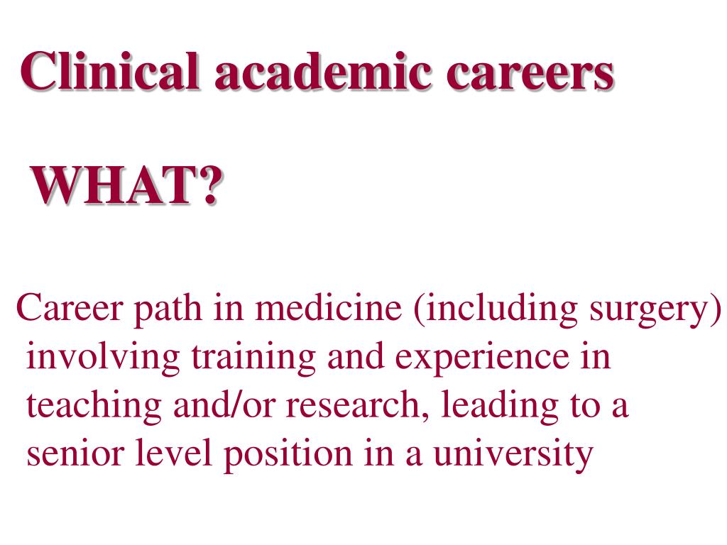 Clinical academic careers WHAT? Career path in medicine (including surgery) involving training and experience in teaching and/or research, leading to a senior level position in a university
