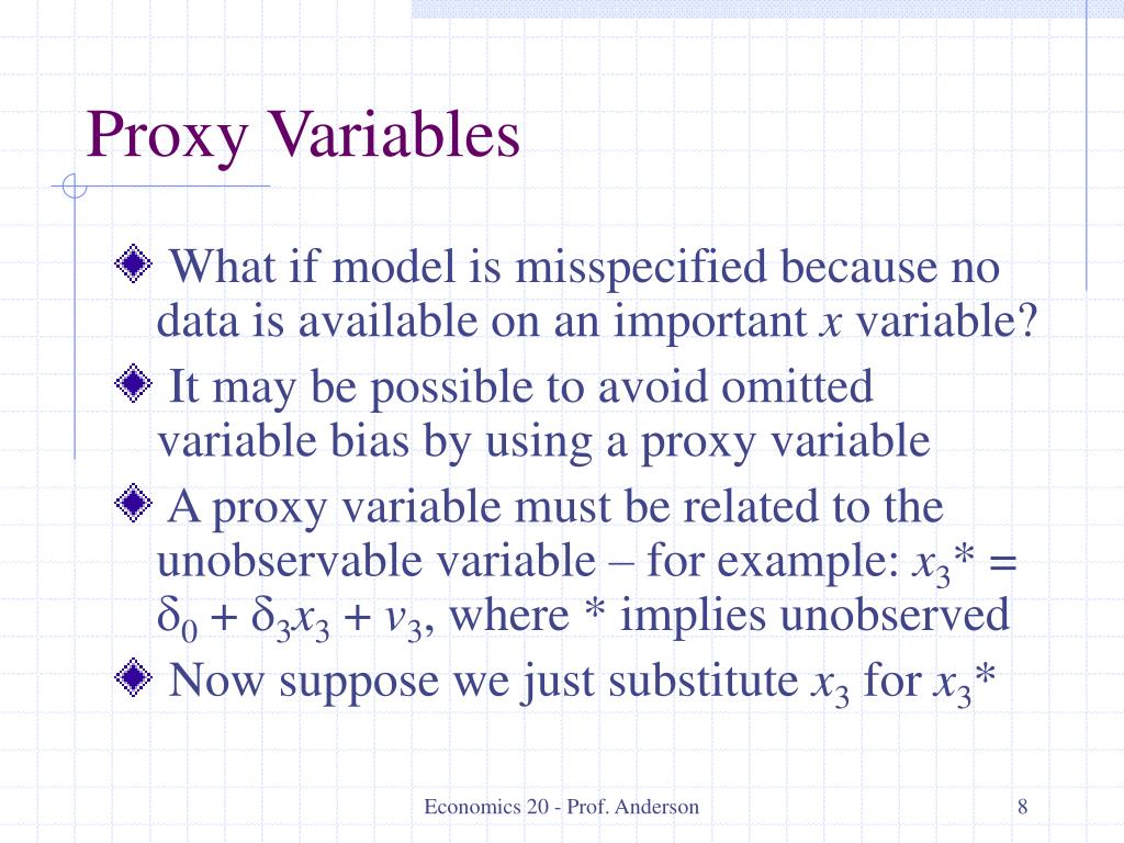 Proxy Variables • What if model is misspecified because no data is available on an important x variable? • It may be possible to avoid omitted variable bias by using a proxy variable • A proxy variable must be related to the unobservable variable – for example: x3* = d0 + d3x3 + v3, where * implies unobserved • Now suppose we just substitute x3 for x3* Economics 20 - Prof. Anderson