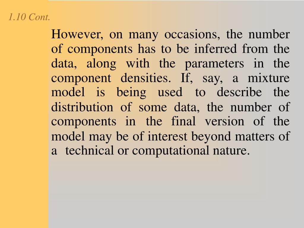 1.10 Cont. However, on many occasions, the number of components has to be inferred from the data, along with the parameters in the component densities. If, say, a mixture model is being usedto describe the distribution of some data, the number of components inthe final version of the model may be of interest beyond matters of atechnical or computational nature.