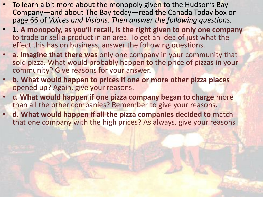 To learn a bit more about the monopoly given to the Hudson’s Bay Company—and about The Bay today—read the Canada Today box on page 66 of Voices and Visions. Then answer the following questions. • 1. A monopoly, as you’ll recall, is the right given to only one company to trade or sell a product in an area. To get an idea of just what the effect this has on business, answer the following questions. • a. Imagine that there was only one company in your community that sold pizza. What would probably happen to the price of pizzas in your community? Give reasons for your answer. • b. What would happen to prices if one or more other pizza places opened up? Again, give your reasons. • c. What would happen if one pizza company began to charge more than all the other companies? Remember to give your reasons. • d. What would happen if all the pizza companies decided to match that one company with the high prices? As always, give your reasons