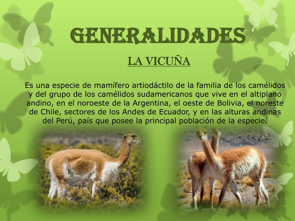 GENERALIDADES LA VICUÑA Es una especie de mamífero artiodáctilo de la familia de los camélidos y del grupo de los camélidos sudamericanos que vive en el altiplano andino, en el noroeste de la Argentina, el oeste de Bolivia, el noreste de Chile, sectores de los Andes de Ecuador, y en las alturas andinas del Perú, país que posee la principal población de la especie.