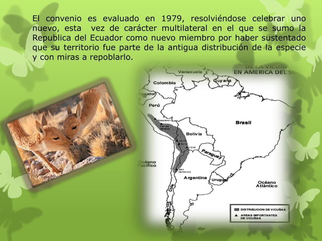 IMPORTANCIA Y LOGROS DEL CONVENIO EN ECUADOR La vicuña es parte del Patrimonio Nacional del Estado y por lo tanto su conservación es de interés público y todas las actividades de gestión de esta especie estarán bajo control del Ministerio del Ambiente. En 1998, se concreta el repoblamiento de vicuñas en el territorio ecuatoriano mediante la donación de vicuñas peruanas, chilenas y bolivianas mediante acuerdos previos del Convenio.
