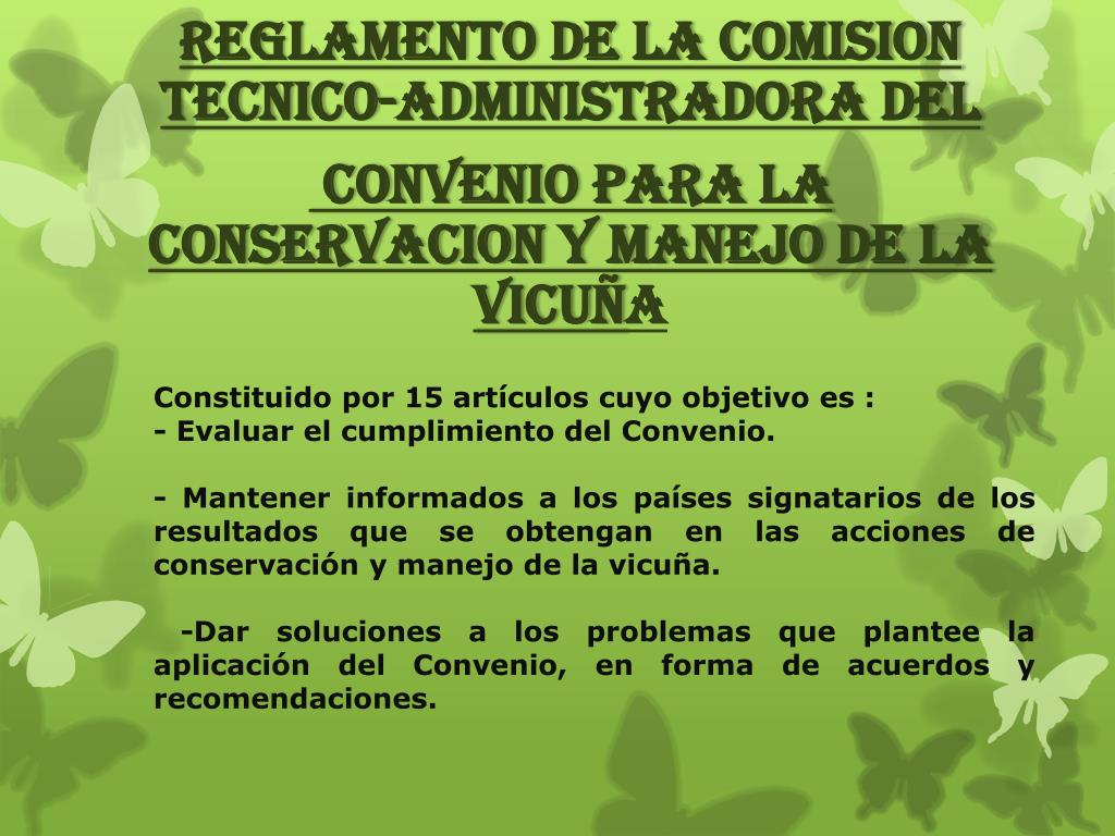 REGLAMENTO DE LA COMISION TECNICO-ADMINISTRADORA DEL CONVENIO PARA LA CONSERVACION Y MANEJO DE LA VICUÑA Constituido por 15 artículos cuyo objetivo es : -Evaluar el cumplimiento del Convenio. - Mantener informados a los países signatarios de los resultados que se obtengan en las acciones de conservación y manejo de la vicuña. -Dar soluciones a los problemas que plantee la aplicación del Convenio, en forma de acuerdos y recomendaciones.