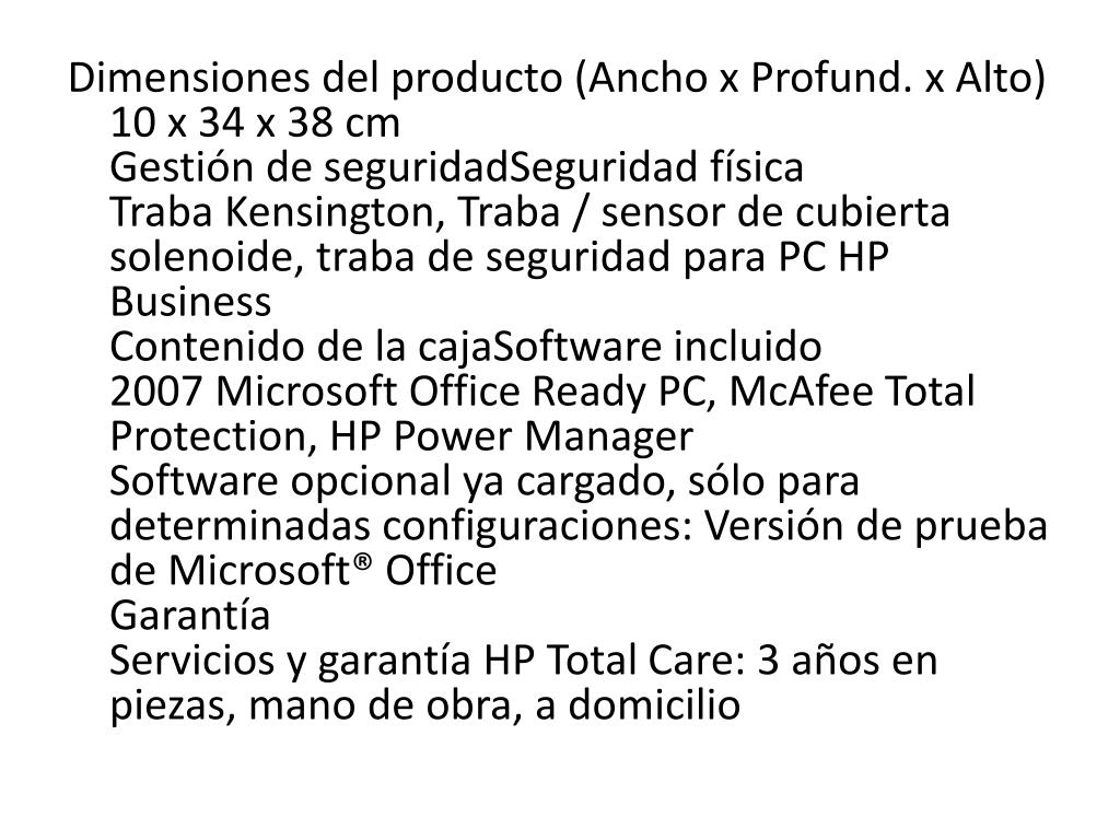 Dimensiones del producto (Ancho x Profund. x Alto)10 x 34 x 38 cmGestión de seguridadSeguridad físicaTraba Kensington, Traba / sensor de cubierta solenoide, traba de seguridad para PC HP BusinessContenido de la cajaSoftware incluido2007 Microsoft Office Ready PC, McAfee Total Protection, HP Power ManagerSoftware opcional ya cargado, sólo para determinadas configuraciones: Versión de prueba de Microsoft® OfficeGarantíaServicios y garantía HP Total Care: 3 años en piezas, mano de obra, a domicilio