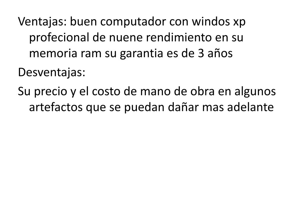 Ventajas: buen computador con windosxpprofecional de nuene rendimiento en su memoria ram su garantia es de 3 años Desventajas: Su precio y el costo de mano de obra en algunos artefactos que se puedan dañar mas adelante
