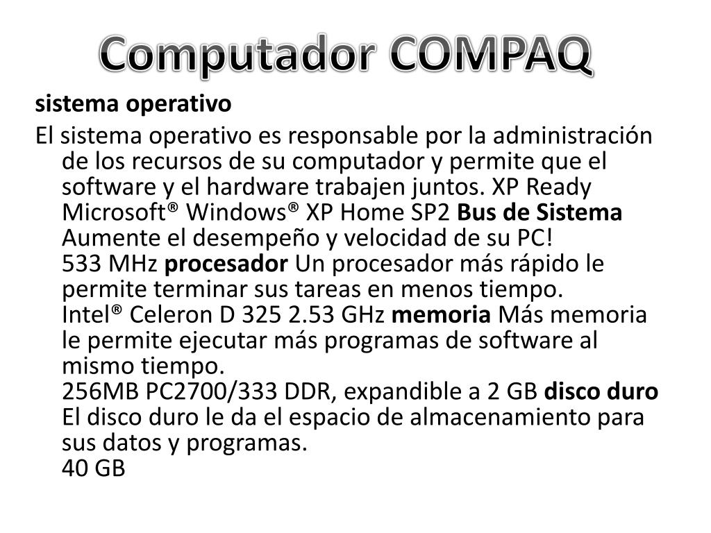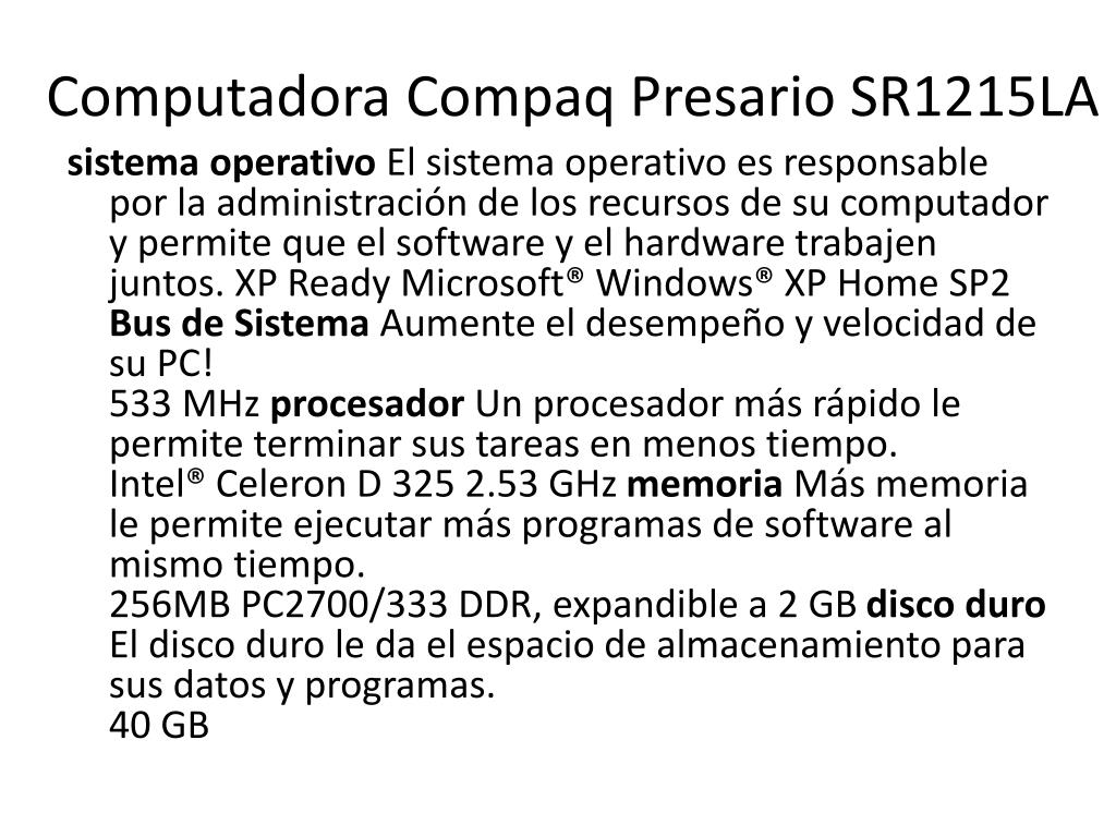 Computadora CompaqPresario SR1215LA sistema operativo El sistema operativo es responsable por la administración de los recursos de su computador y permite que el software y el hardware trabajen juntos. XP Ready Microsoft® Windows® XP Home SP2 Bus de Sistema Aumente el desempeño y velocidad de su PC! 533 MHz procesador Un procesador más rápido le permite terminar sus tareas en menos tiempo. Intel® Celeron D 325 2.53 GHz memoria Más memoria le permite ejecutar más programas de software al mismo tiempo. 256MB PC2700/333 DDR, expandible a 2 GB disco duro El disco duro le da el espacio de almacenamiento para sus datos y programas. 40 GB
