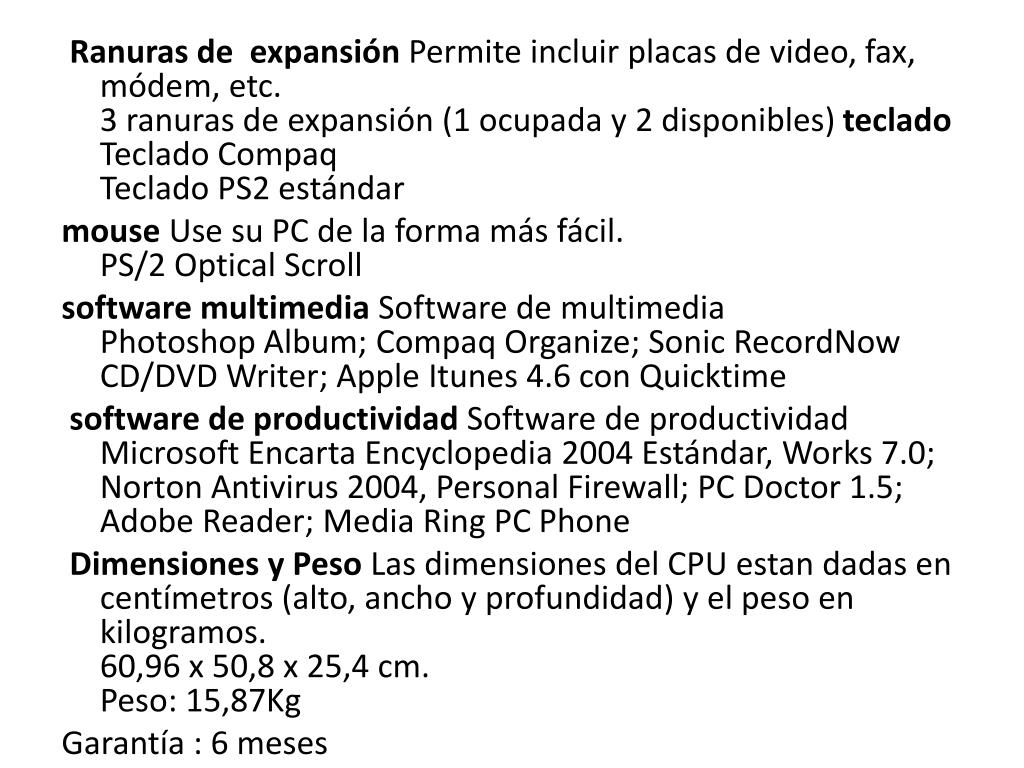 Ranuras de expansión Permite incluir placas de video, fax, módem, etc. 3 ranuras de expansión (1 ocupada y 2 disponibles) teclado TecladoCompaqTeclado PS2 estándar mouse Use su PC de la forma más fácil. PS/2 OpticalScroll software multimedia Software de multimedia PhotoshopAlbum; CompaqOrganize; SonicRecordNow CD/DVD Writer; Apple Itunes 4.6 con Quicktime software de productividad Software de productividad Microsoft Encarta Encyclopedia 2004 Estándar, Works 7.0; Norton Antivirus 2004, Personal Firewall; PC Doctor 1.5; Adobe Reader; Media Ring PC Phone Dimensiones y Peso Las dimensiones del CPU estan dadas en centímetros (alto, ancho y profundidad) y el peso en kilogramos. 60,96 x 50,8 x 25,4 cm.Peso: 15,87Kg Garantía : 6 meses