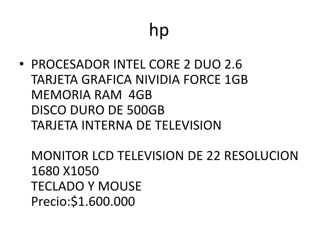 hp • PROCESADOR INTEL CORE 2 DUO 2.6TARJETA GRAFICA NIVIDIA FORCE 1GBMEMORIA RAM 4GBDISCO DURO DE 500GBTARJETA INTERNA DE TELEVISION MONITOR LCD TELEVISION DE 22 RESOLUCION 1680 X1050TECLADO Y MOUSE Precio:$1.600.000