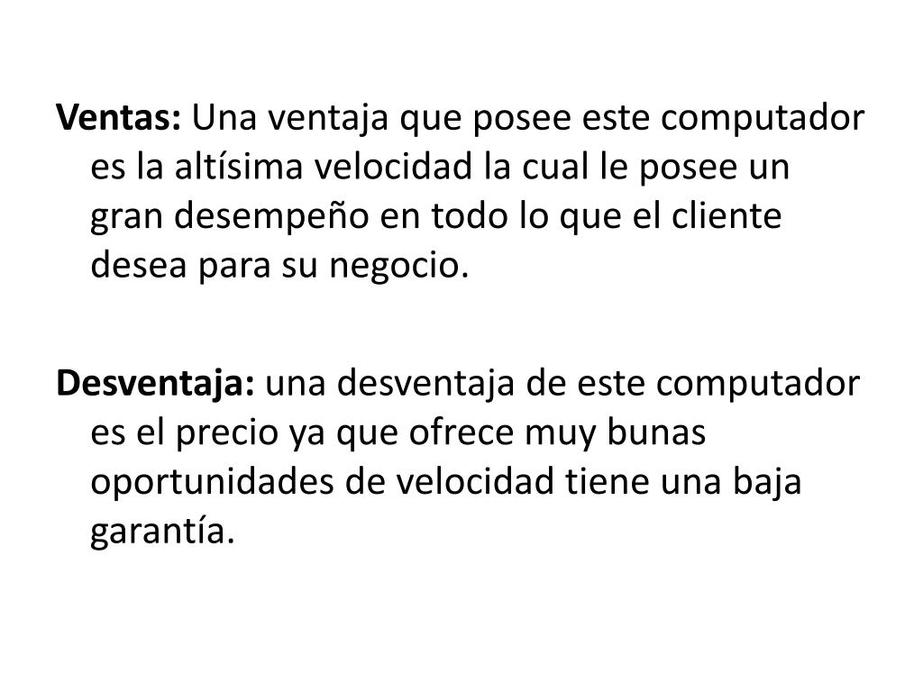 Ventas: Una ventaja que posee este computador es la altísima velocidad la cual le posee un gran desempeño en todo lo que el cliente desea para su negocio. Desventaja: una desventaja de este computador es el precio ya que ofrece muy bunas oportunidades de velocidad tiene una baja garantía.